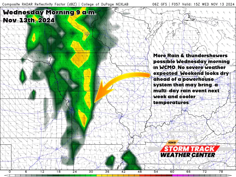 No severe weather expected but we could see some moderate rainfall through Thursday. Saturday (opening day of deer season) right now looks dry, but all eyes will be on a possible strong cut-off low that could provide West Central Missouri with a multi-day rain event that would usher in much cooler air from the north beginning on Sunday;