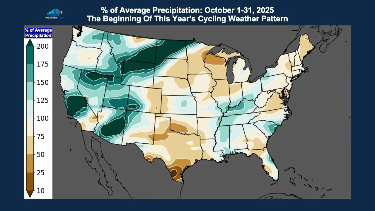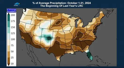 Good morning everyone! I thought I would spend a little time this morning and give you all an update on the new LRC cycle setting up as we speak. Remember, the new cycle sets up around October 6th. We take a look at the weather pattern daily, especially at the 500mb level (18k feet above us) and watch for similar repeats. We will then figure out the days between the cycles. We can then apply that long range to give us a better than 80 percent long range forecast for the next 10 months! We will then have a great idea of what our winter, spring storm season and our summer will be like in WCMO. I am seeing some big changes already to the weather pattern so far. Take a look at the moisture for the month of October of 2024, which was the first month of the 2024 LRC;
