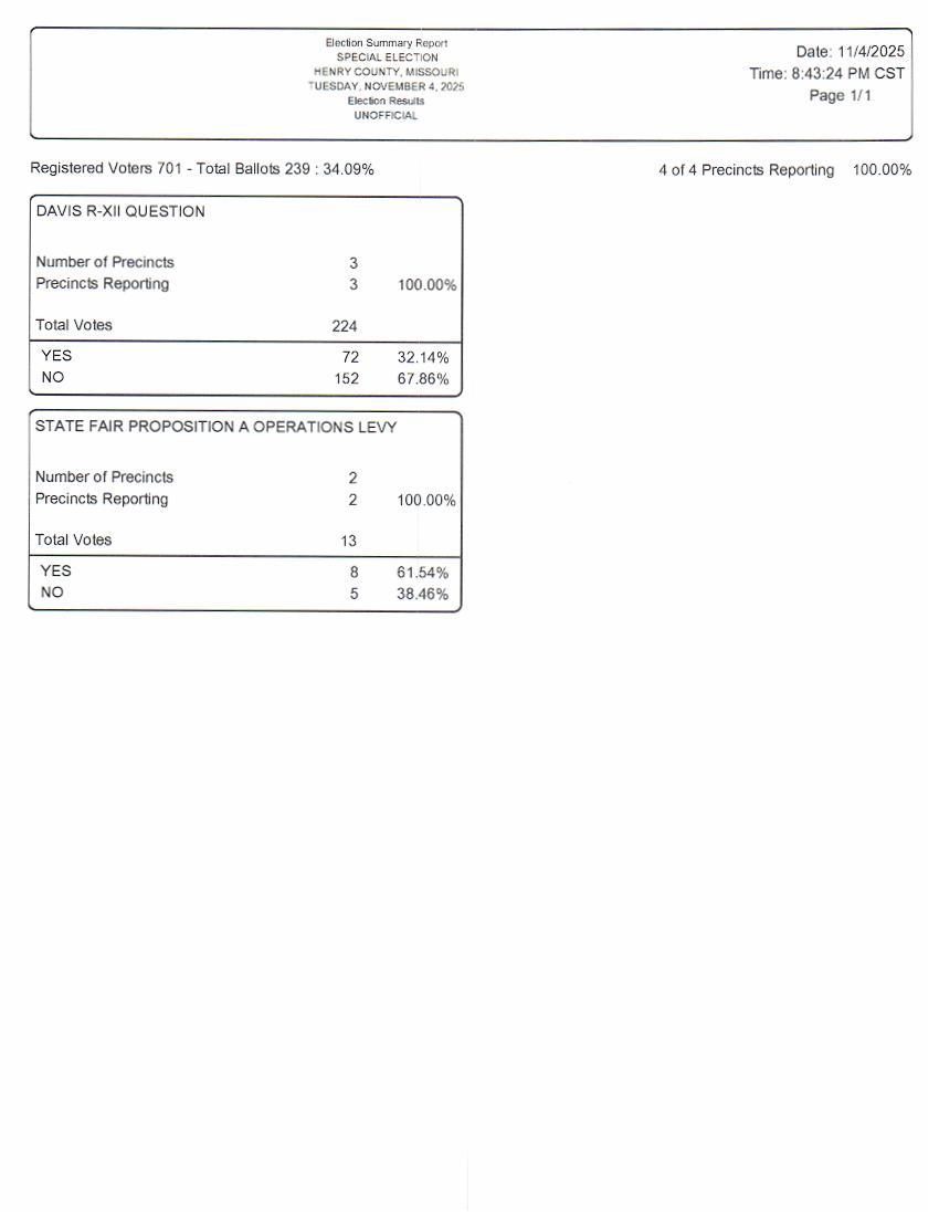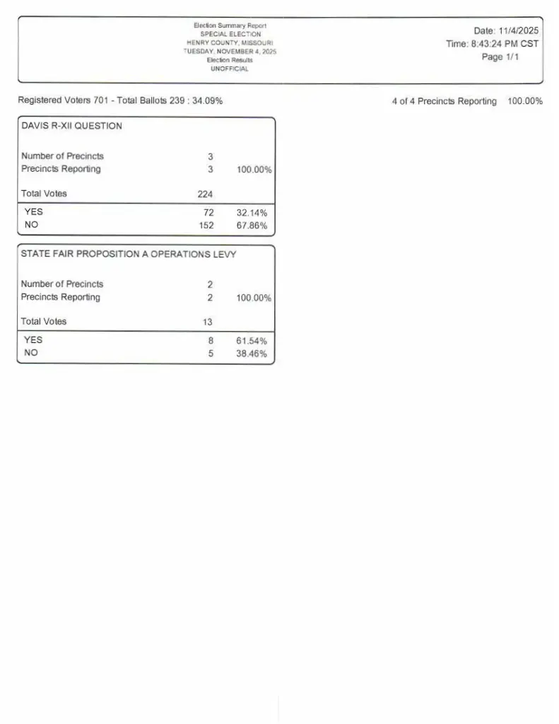 The Davis R-XII School District questioned proposal failed, with 67.86% (152 votes) against and 32.14% (72 votes) in favor. The measure, which required a simple majority to pass.