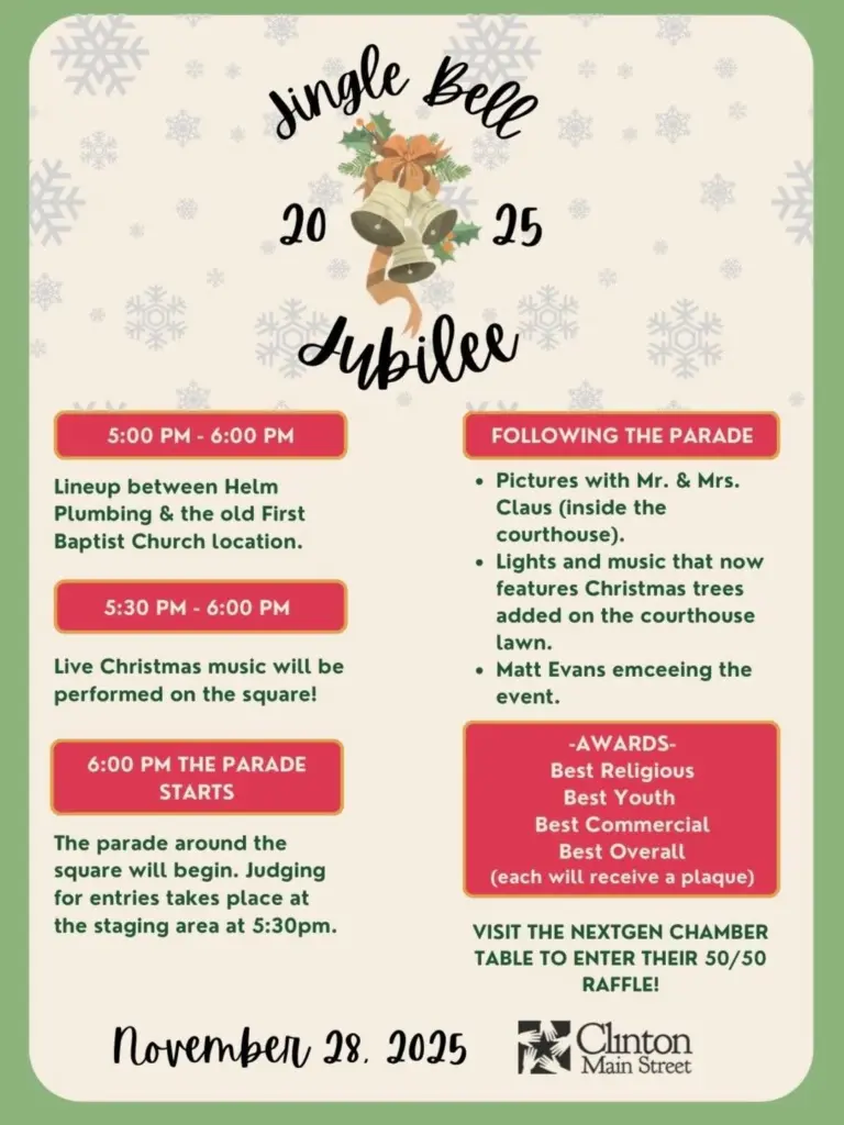 Downtown Clinton will come alive with the sights and sounds of the season during this year’s Jingle Bell Jubilee, welcoming families and visitors to enjoy holiday lights, festive floats, and community cheer.