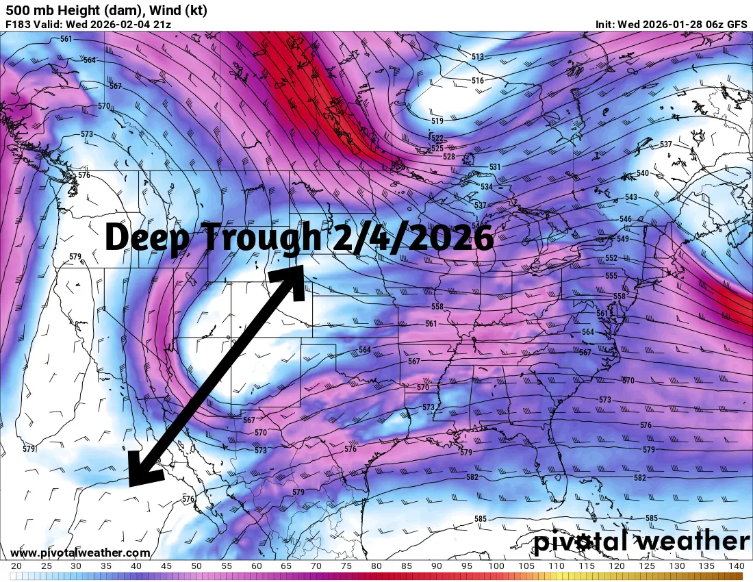 We had the system on the 24th-27th move in and was a weak system, but coupled with the brutal cold Arctic air, turned a small system into our biggest snow producer of the year. The LRC is showing a big system set to arrive around February 3rd through around the 6th. Models are already showing this potential storm brewing a few days ago. Here is what it looks like based on the American GFS data today;