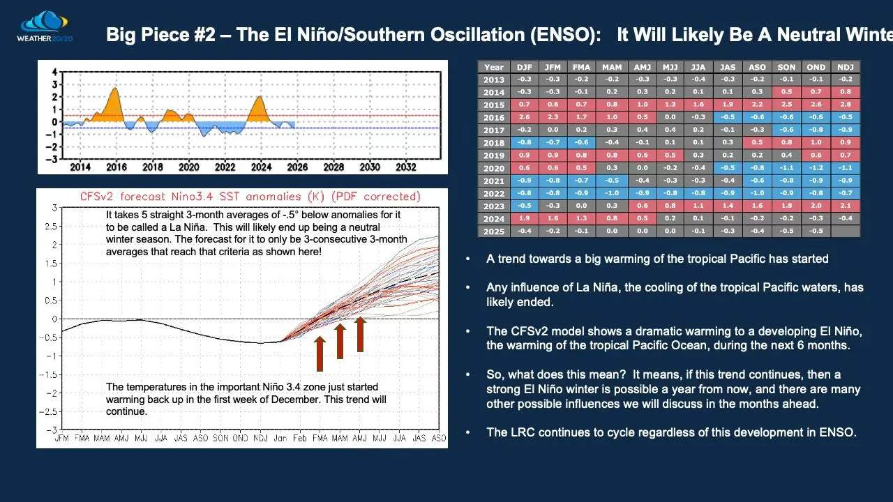 These have been forecasted back in November, when the LRC projected California to be very wet and Colorado very dry, contrast to what every other winter forecast was projecting. California has had record moisture and the slopes of the Colorado ski resorts are experiencing historically record lack of snow. We are in the middle of these ridges and troughs here in West Central Missouri. As the huge storm systems come in from California, they are weakened considerably across the anchor ridge to our west. With High Pressure Ridge, remember the air rotates clockwise around it. So as the weakened system hits the ridge, it goes up and over most of Missouri, then strengthens and nails the North East. This is exactly what is happening today, as a historical snow storm is blanketing the upper North East. In a High Pressure Ridge, air sinks and warms close to the surface, hence the well above average temperatures over the Great Plains. So we are in kinda like a battle ground for the air masses and the warm air has won majority of the time. This same cycle will likely continue through the summer and fall. This spells bad news for farmers and ranchers unless something changes. We are seeing a strong warming of the Pacific waters, transitioning into an ENSO neutral phase, and quite possible into a full El Nino by summer. I have had a discussion in previous blogs about what it takes to be El Nino and the repercussions. So basically, we could see a bit more moisture if this was to unfold. Here is a snapshot of what it takes for La Nina and El Nino below: