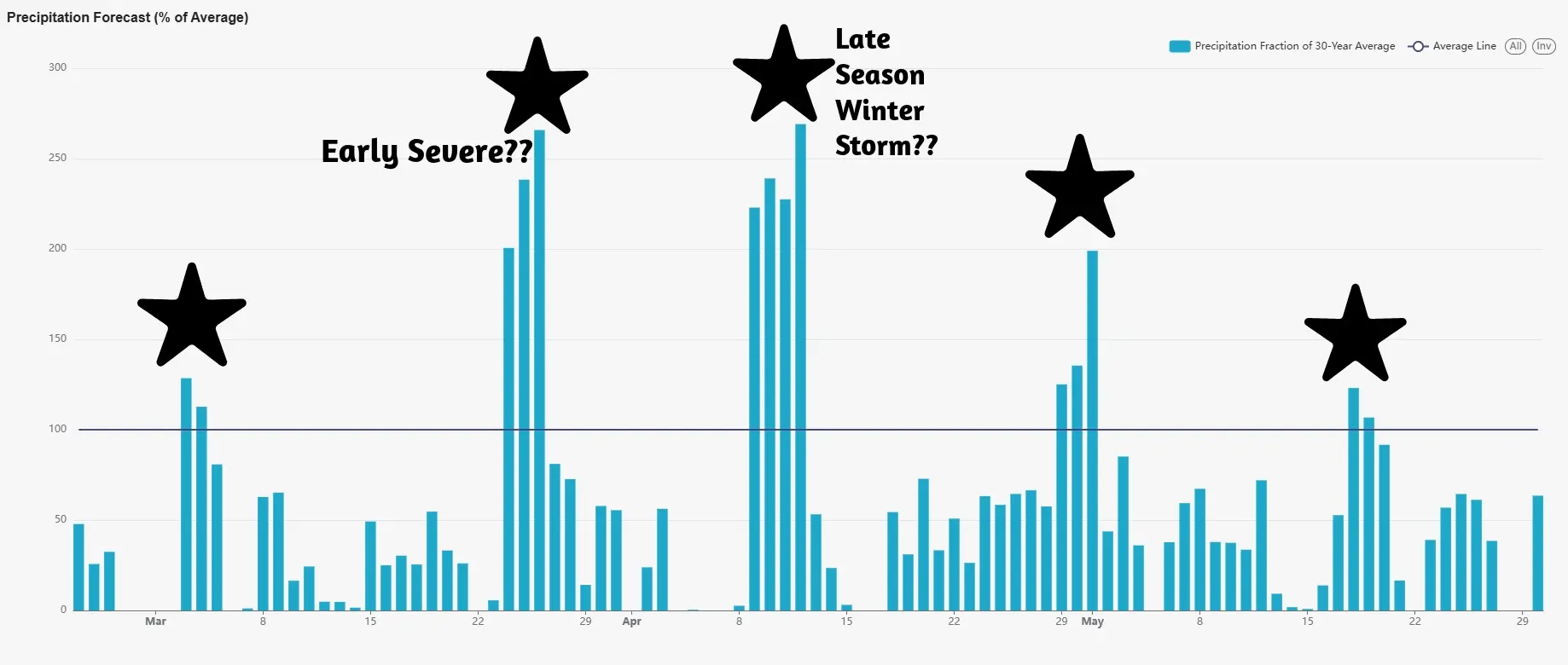 What does all this mean for the rest of Winter??? More well above average temperatures and continued cycle right on track. With this type of cycling mode, I think we do have a shot of seeing an early start to severe weather season, as well as a chance to see a late season snow in April. Here is a look at LRC Dashboard, and you can see storm systems and due dates by the stars. The soonest is Feb 23-26, in which we have a weak system moving into WCMO on Wednesday night. I think Ole’ Man Winter may still have a few tricks up its sleeve but Severe Suzie may enter into our lives by the 3rd/4th week of March.